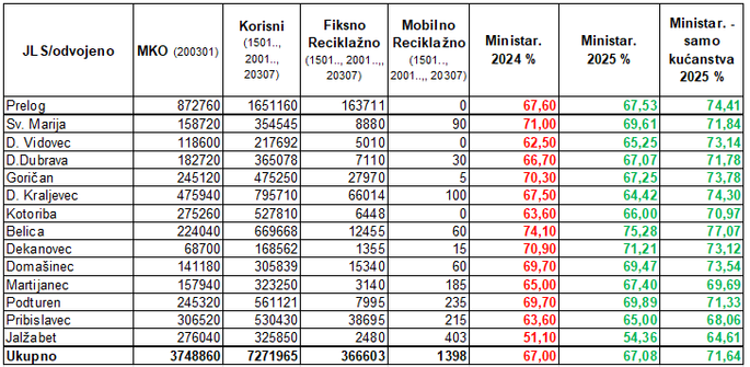12.03.2026. U prošloj 2025. godini sakupljene i/ili obrađene su rekordne količine otpada od 17.930.666 kg, što je rast od 11,04% u odnosu na 2024. godinu. U sklopu javne usluge sakupljeno je 11.388.826 kg otpada što je povećanje za 3,42 % u odnosu na prethodno razdoblje. Sakupljeno je 3.748.860 kg miješanog komunalnog otpada što je povećanje za 3,32 % u odnosu na 2024. godinu. Količine MKO sakupljene od kućanstava povećale su se za 1,55%, dok se količina MKO od ne kućanstava povećala za 9,73 %. U 2025. godini udio odvojeno sakupljenog, obrađenog i oporabljenog korisnog otpada po evidenciji u skladu sa Ministarstvom zaštite okoliša i zelene tranzicije iznosi 67,08% što je povećanje za 0,03 % u odnosu na 2024. godinu. Postoci odvajanja otpada kreću se od 54,36% u Općini Jalžabet do 74,41% u Općini Belica koja je i dalje vodeća JLS sa najboljom stopom odvajanja otpada. Kada bi iz izračuna izdvojili MKO od ne kućanstva postotak odvojeno sakupljenog otpada penje se na 71,64%. Prosječno kućanstvo proizvede godišnje 227 kg miješanog komunalnog otpada, a prosječni stanovnik napravi godišnje samo 71 kg miješanog komunalnog otpada. Sa tim rezultatima očekujemo da će naše JLS i dalje ostati među najboljima u Republici Hrvatskoj.